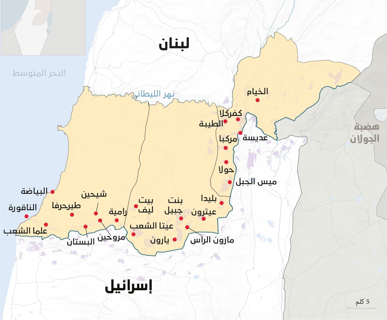 واللافت فيه أن من ضمنه بلدات لم تدخل إليها إسرائيل وتوجد على أطرافها، ومنها مسيحية مثل دبل ورميش وعين إبل والقوزح، ومنها ذات أغلبية درزية مثل الماري والمجيدية وشويا في قضاء حاصبيا، ومنها سنية مثل الهبارية وكفرحمام وكفرشوبا وشبعا، أي إنها تسيطر عليها بالنار ويبلغ عددها نحو 20، بينما تحتل نحو 35 بلدة مع دخول الهدنة حيّز التنفيذ.