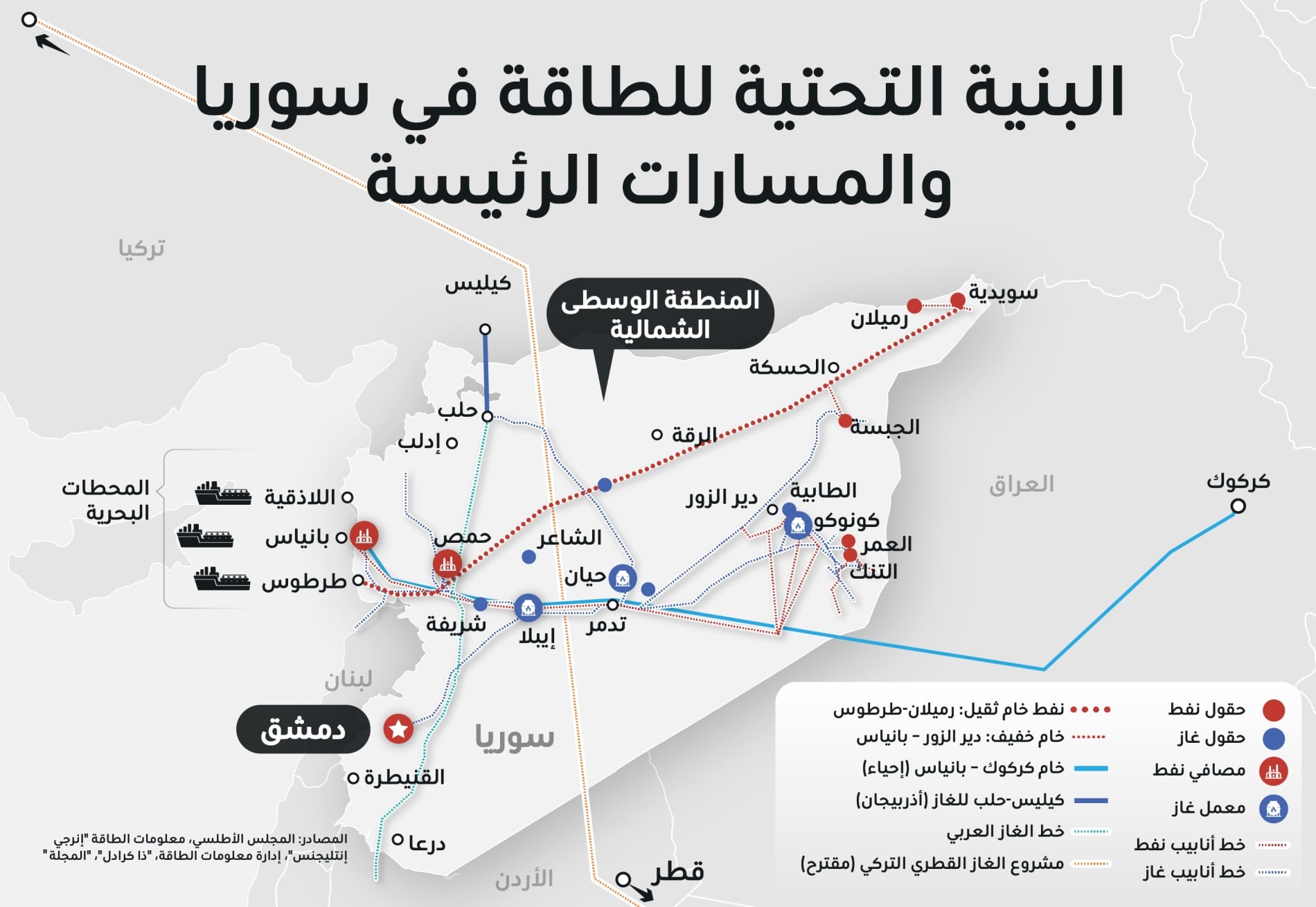 في ما يتعلّق بالممرّات نفسها، تضع الخطة في الواجهة مشروع إحياء خط كركوك - بانياس الممتدّ من العراق عبر سوريا إلى المتوسط، بكلفة تقارب 4.5 مليارات دولار، وعلى مدى 36 شهرًا، وبسعة قد تصل إلى 1.5 مليون برميل يوميًا عبر خطين جديدين (مع حديث عن إمكان تمديده لاحقًا إلى ميناء طرابلس) وإلى جانبه يعود مشروع خط غاز قطر - تركيا، الذي يربط الخليج بالأردن وسوريا فتركيا ثمّ أوروبا، كجزء من مسار يتجاوز الإمدادات الروسية.